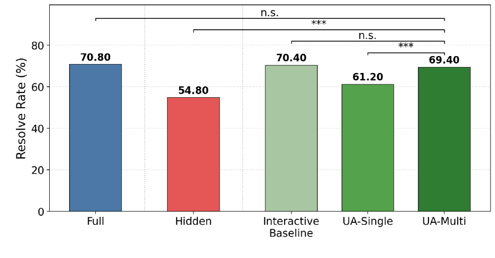 논문은 underspecified SWE-bench Verified 환경에서 실험했습니다. 즉, 원래 GitHub 이슈에서 일부 핵심 정보를 숨기고, 에이전트가 그 빈칸을 질문으로 메울 수 있는지를 본 것입니다.